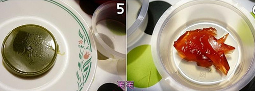 6、将适量抹茶粉与寒天混合,放置于小容器中等凝固,切成小金鱼的形状。