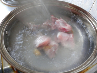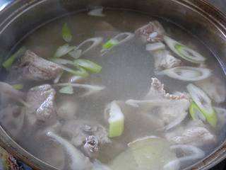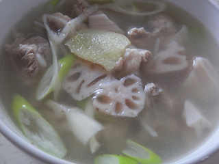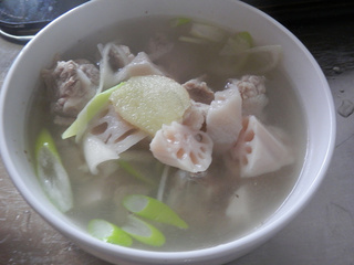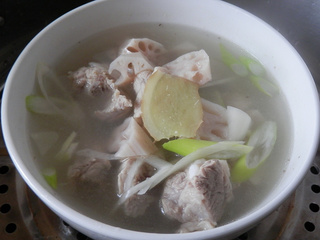 莲菜排骨汤,很经典的一道家常美食 莲菜排骨汤用料工具 主料: 莲菜 (适量) 排骨 (适量) 葱 (少许) 姜 (少许) 调料: 盐 (少许) 厨具: 蒸锅、炒锅 莲菜排骨汤的做法: 1.猪小排,清洗干净,沥干水份 2.准备其它食材 3.清水入锅,加入几片姜 4.放入排骨焯水,撇出浮沫 5.焯好水的排骨捞出备用 6.莲菜切滚刀块、姜切片、葱斜切成片 7.依次放入姜片、葱片、莲菜块、焯过的排骨,煮2分钟 8.盛入汤碗 9.蒸锅上火,水开后,放入排骨汤,大火蒸20分钟即好 10.取出食用前加少许盐即可