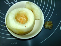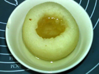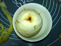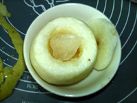 先挖梨核再去皮,便于拿取。 梨皮也可以不去,连皮蒸食。 蒸制时间需根据梨的大小调整。