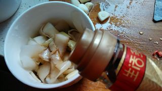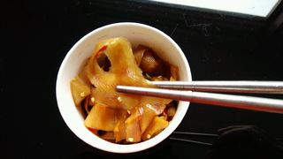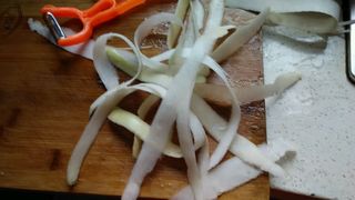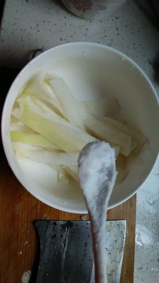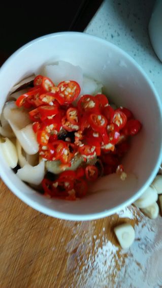 酱脆萝卜适合所有季节哦,脆脆的爽口 酱脆萝卜皮用料工具 主料: 萝卜 (1个) 红辣椒 (5个) 调料: 白糖 生抽 老抽 陈醋 厨具: 其它 酱脆萝卜皮的做法: 1.材料集合,白萝卜辣椒,葱花 2.用削皮刀将萝卜表皮削好,洗干净 3.削好的萝卜皮放适量盐腌渍20分钟 4.腌渍好的萝卜皮洗干净沥干水 5.放3勺生抽,1勺老抽拌匀 6.放少许白糖提鲜 7.加上辣椒拌匀 8.拌匀腌渍20分钟 9.洒少许葱花 10.香脆爽口