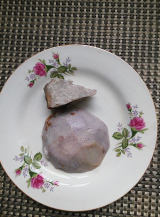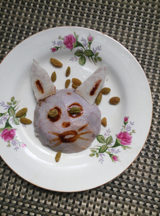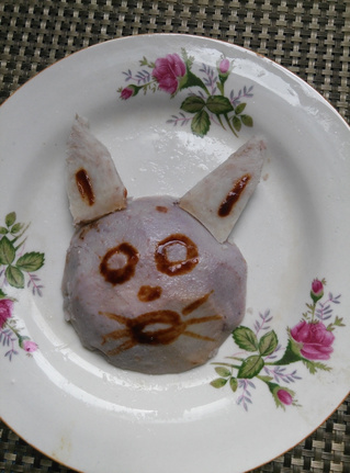 儿童小吃,玩点花样。 芋头猫咪用料工具 主料: 芋头 (100g) 葡萄干 (5g) 调料: 盐 (3g) 厨具: 蒸锅 芋头猫咪的做法: 1.芋头 2.切头部一片,蒸熟。 3.趁热浸在盐水中。冷后取出。 4.切成如图。 5.用酱,笔画上眼睛等。 6.用葡萄干装饰。