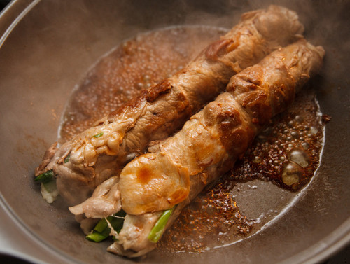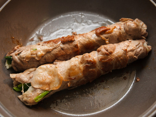 3、起油锅,把葱肉卷下锅油煎。(各面都要煎到)