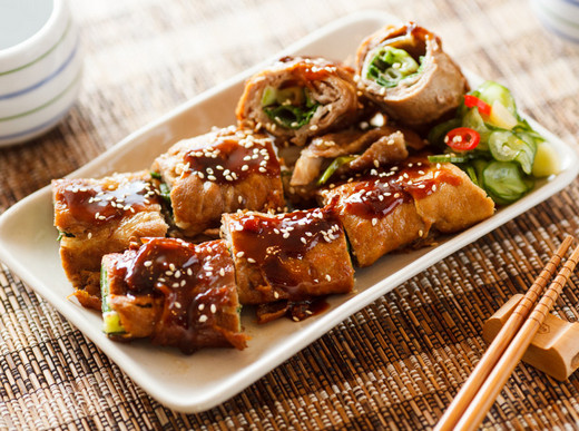 5、等猪肉熟透起锅后,将多余的酱汁收干,并淋在葱肉卷上,最后再洒上白芝麻就完成了。