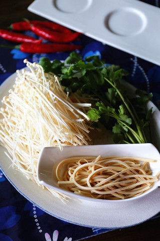 口感:清脆爽口,咸鲜适宜。 小提示:豆腐皮要煮熟,可以煮久一点。金针菇只需烫30秒左右即可。