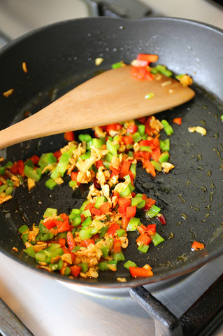 主料: 茄子 (1根) 小葱 (切末) 大蒜 (切末) 青椒 (1个切丁) 红椒 (1个切丁)