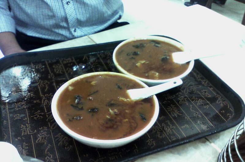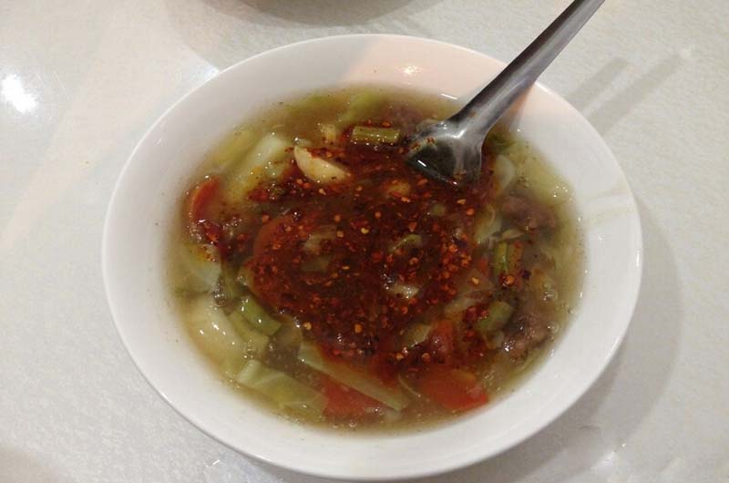 所谓的胡辣汤,其实有点大锅烩的意思,将很多的食材都聚在一小碗里,用料十分的足啊,而且加入了花椒和辣椒这两种做菜法宝,使得胡辣汤跟它的名字一样,又麻又辣。胡辣汤在北方特别常见,经常可以看到,人们把胡辣汤当做早饭,就着一个饼或是一根大葱,这就是他们所认为的最好的也最营养的早餐了。而在南方,因为人普遍比较斯文,关于下午饭,南方人一般是选择在一个优雅的环境喝着咖啡,吃着点心,或是约上一两个朋友,在肯德基、麦当劳这种快餐厅点上一些最近新出的下午茶系列。可是北方人依然是一碗胡辣汤搞定,可见胡辣汤在他们的心目中占据着重要的地位。