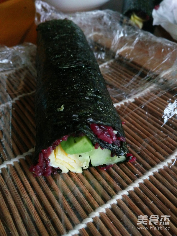 3.寿司席先用保鲜膜里里外外包好,然后平铺一张海苔,将拌有牛油果跟白醋的米饭均匀铺在还台上,然后放入健康的孕妇食品:鸡蛋+黄瓜+牛油果,再借助寿司席将寿司卷实。
