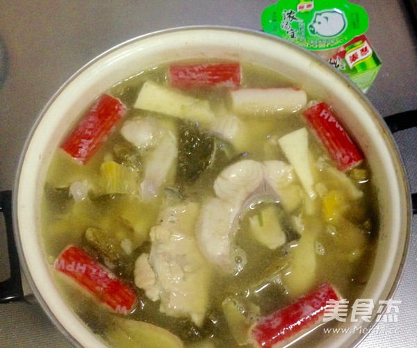 用浓汤宝就是快速 主料 草鱼700克 酸菜1包 冬笋1个 蟹棒1份 生菜1棵 浓汤宝2块 豆腐1盒 辅料 料酒15毫升 生姜1块 盐适量 葱2棵 花椒油1勺 浓汤宝酸菜鱼火锅的做法 1.将买来的草鱼洗净切片后用料酒,盐,姜丝,葱花、随便淀粉拌匀腌制15分钟,鱼骨放一边备用 2.主要食材 3.用平底锅放油煎鱼骨一下 4.锅中放入水及2浓汤宝煮开 5.加入鱼骨及酸菜炖一会儿(喜欢辣,可以添加辣椒及花椒少许) 6.再加入豆腐,蟹肉棒及鱼片煮熟,淋点花椒油增加香味 7.吃时再放生菜烫 烹饪技巧 加入辣椒比较香,蔬菜可以自己选择