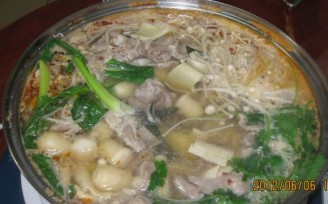 7.水煮开后先下肉、再开即可吃了,肉煮好后下入蔬菜及蘑菇、干豆腐等。