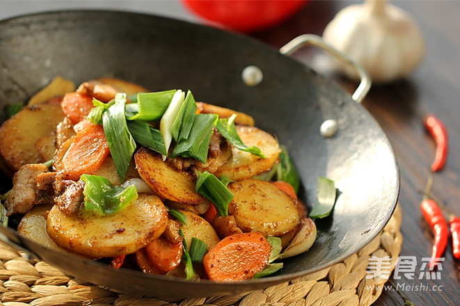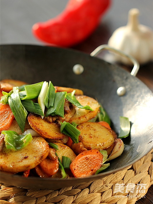 1、提前将原料处理一下:土豆片煎至双面金黄;红萝卜为了更能吸收营养也用油煸炒一下;而青椒很容易熟,无须处理; 2、五花肉本身还有油脂, 所以只用煎菜剩余的油就可以了, 将五花肉油脂煸炒出来, 也让我们吃起来不腻; 3、干锅菜无须加入水, 而是通过调味料生抽和料酒翻炒熟, 并且还需将水分炒干, 让整道菜干香浓郁; 4、加入点孜然更有点烧烤的味道,完全个人喜好;如果喜欢辣的还可以加入点辣椒粉,所以按自己口味调整选择加入。