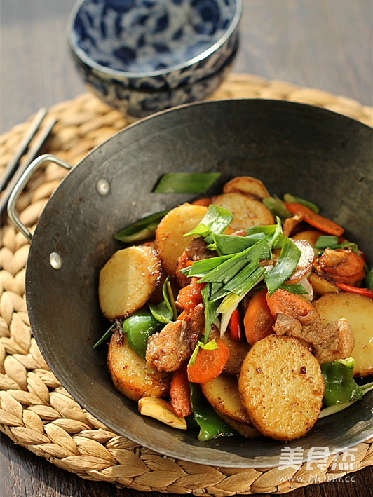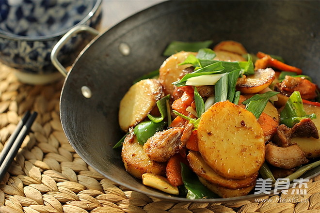 干锅土豆片,微微煎炸过的土豆片外焦里嫩,再配上五花肉的肉香,红绿的萝卜和青椒,也可根据自己的口味适当添加辣椒等调味料,最后加入味道浓郁的孜然,煸炒过土豆片焦香下饭,香辣过瘾,别有一番风味。
