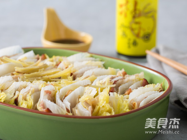1.五花肉切薄片。取娃娃菜的叶子,先垫一片叶子,再盖上五花肉。