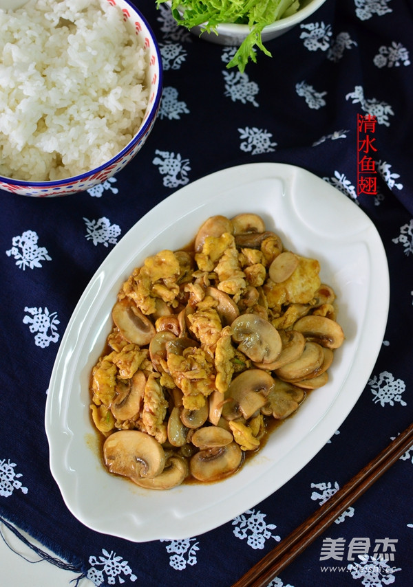 4.鲍汁和酱油在油中炸香后再翻炒蘑菇,将鸡蛋倒入后一同翻炒,加适量的盐调味,最后淋入少许水淀粉,关火,再淋少许香油出锅。