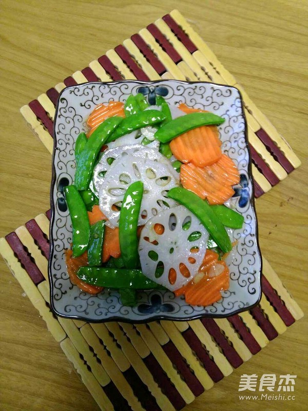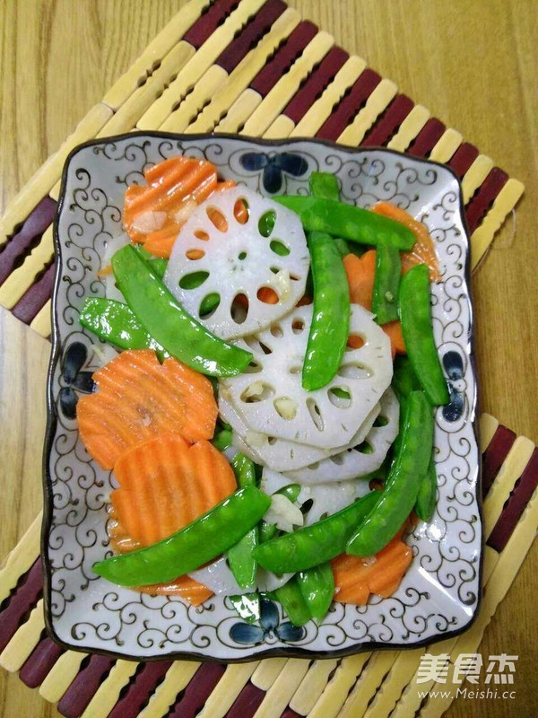 1、胡萝卜花片的改刀方法,将胡萝卜去皮后四面切凹槽,用花刀切片,一片片可爱的花朵就切好了。 2、荷兰豆热水焯要快速捞出投凉。 3、藕片热水焯时加点白醋会使藕片更白更脆。 4、要大火快速翻炒,使食材色彩鲜艳口感脆脆的。