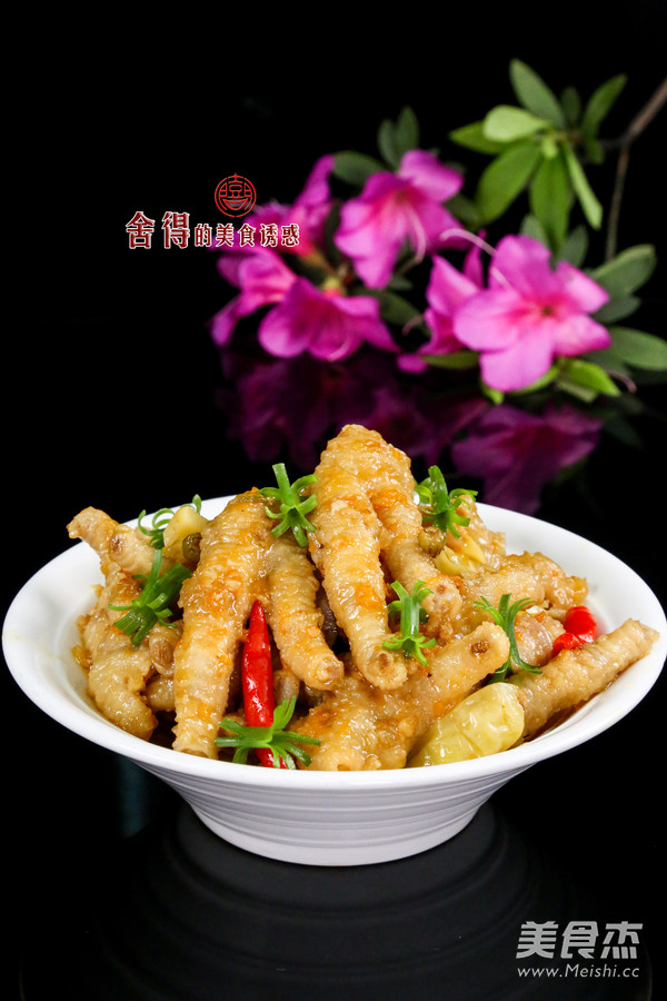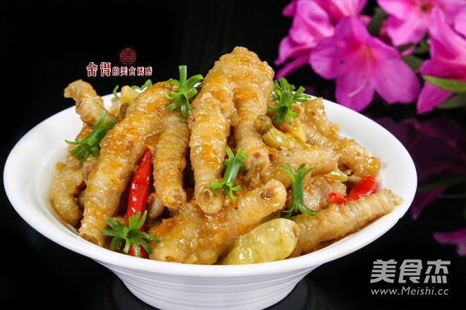 6.下入凤爪,开大火一起煸炒;加入适量的野山椒水,炒均,野山椒水有酸味,不用加醋了。