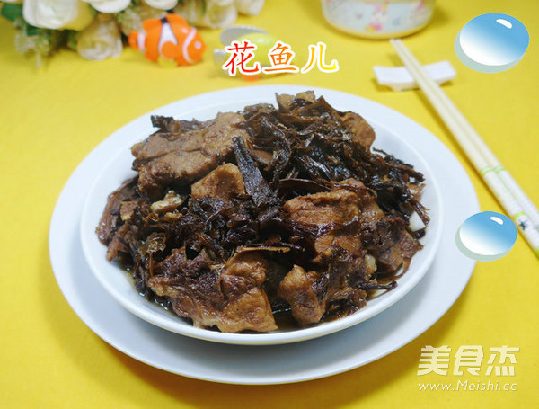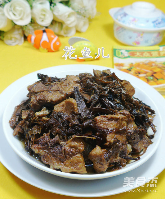 花鱼儿家的菜菜。。。 主料 龙骨555克 辅料 笋干菜45克 料酒2汤勺 生抽3汤勺 白糖1.5汤勺 盐1.5勺 油4汤勺 笋干菜烧龙骨的做法 1.食材:龙骨(已清洗焯水)、笋干菜(已泡发) 2.将已泡发好的笋干菜淘洗一下,待用 3.在锅中加入4汤勺油烧热,下入焯好的龙骨翻炒翻炒 4.随后,加2汤勺料酒 5.加适量的清水煮开 6.接着,合入淘洗好的笋干菜翻动一下 7.然后,加3汤勺生抽 8.加1.5汤勺白糖 9.加1.5勺盐 10.调味煮开 11.最后,煮至汤汁差不多了,即成