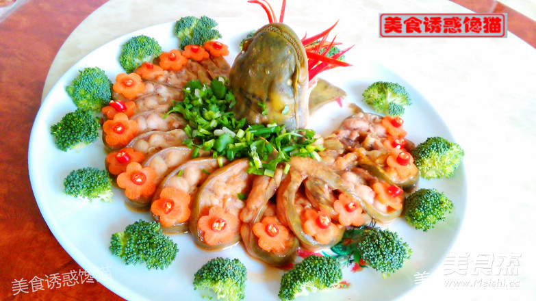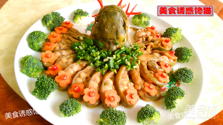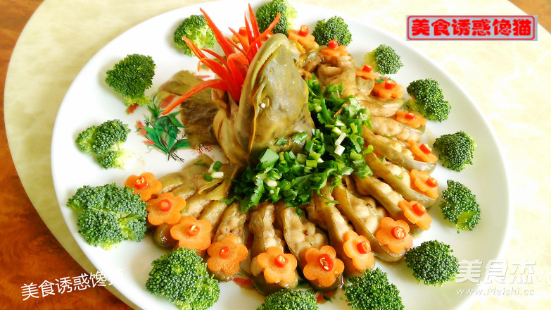 8.小心取出蒸好的鱼,倒掉蒸出的汤汁。将葱姜碎撒在中间(鱼头周围),摆上红辣椒、胡萝卜、芥兰花作装饰
