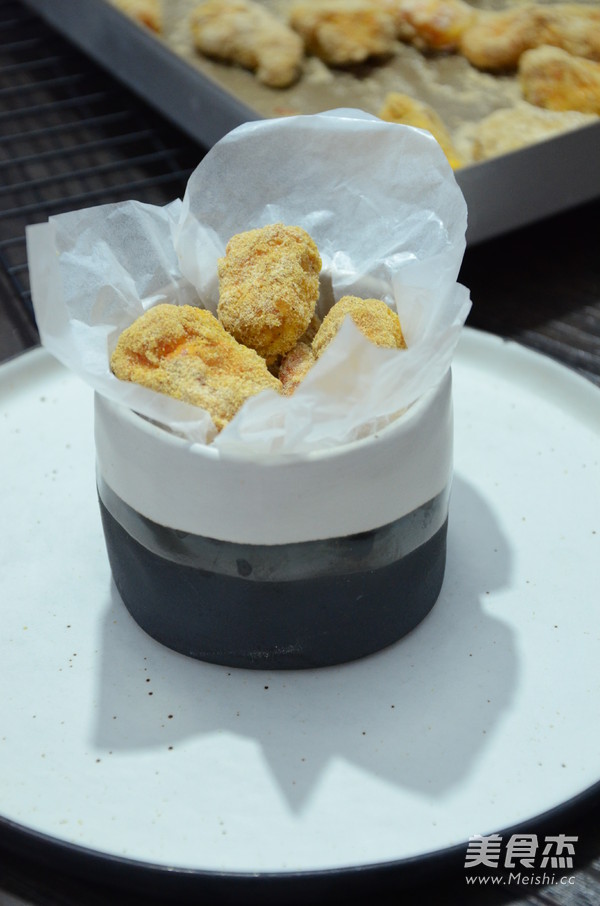 7.将准备好的鸡米花装入烤盘, 烤箱预热, 180度大约烤20分钟即可