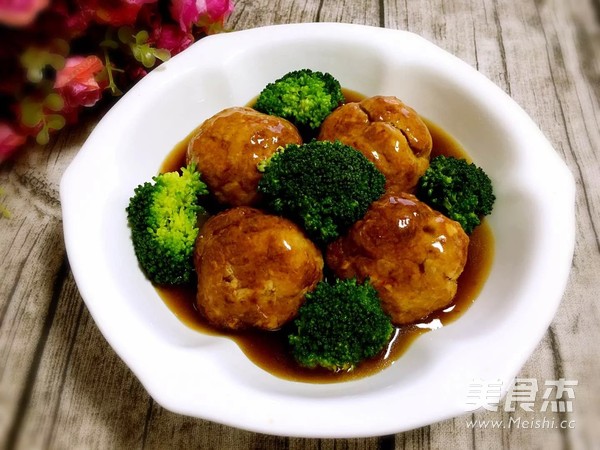 11.淋在丸子上装盘,用焯熟后的西兰花围在丸子边上即可。