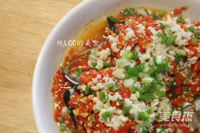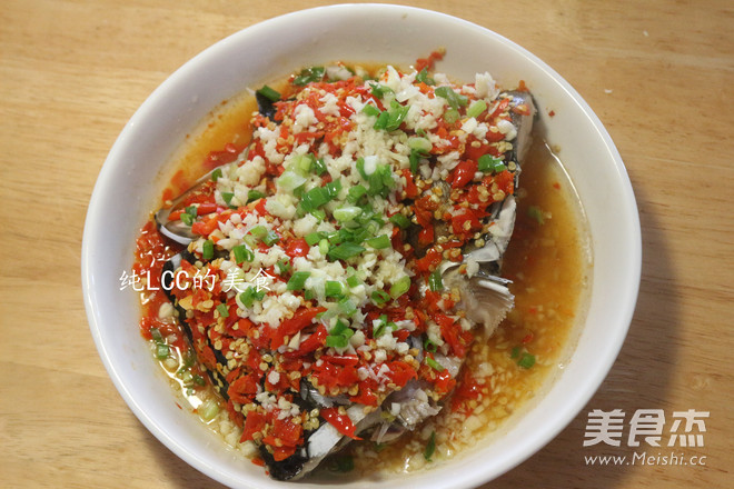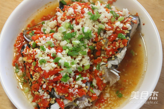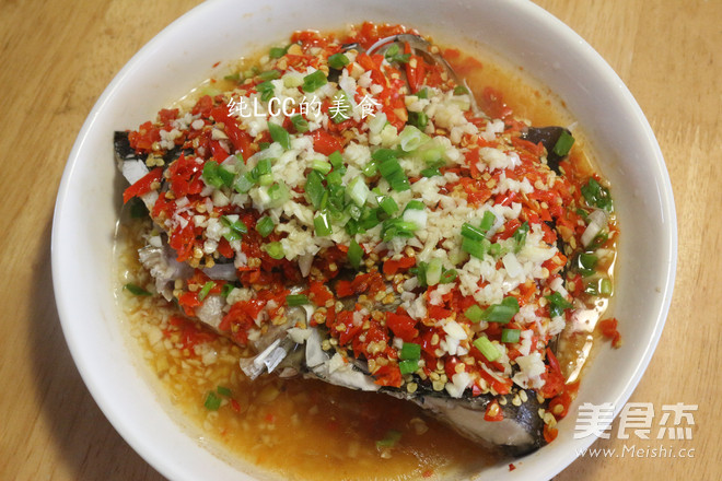 4.再在鱼头上放入自制的剁椒酱,上锅蒸20分钟