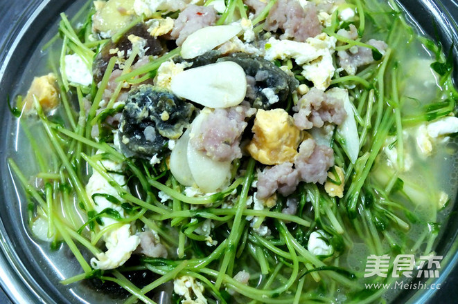7.等水烧开后先入少许盐,记住只放一点点就够了,因为咸蛋白是比较咸的。然后将豆苗放入烫熟关火。不要煮太久,很易熟,起锅前入鸡精装盘即可