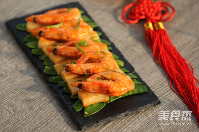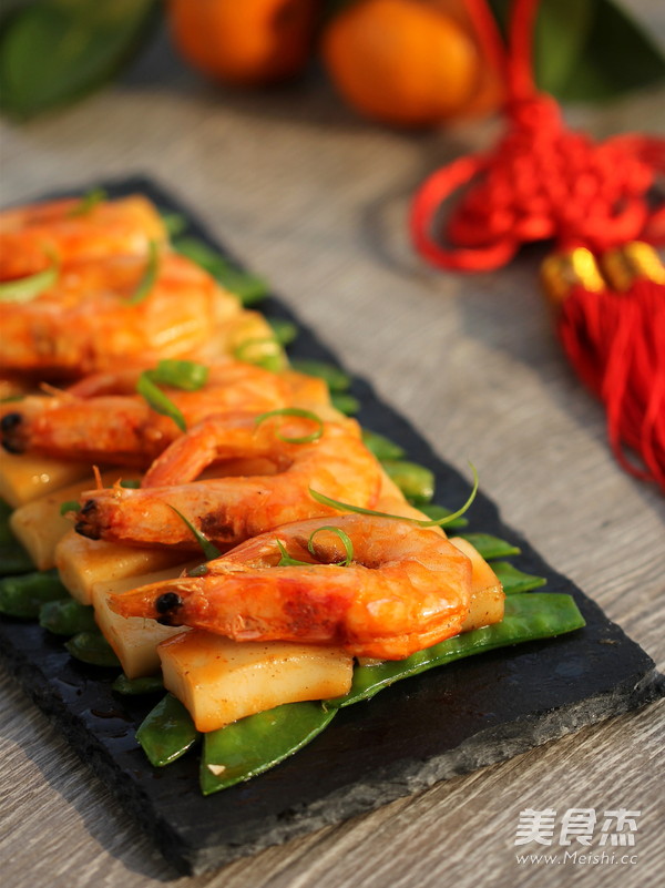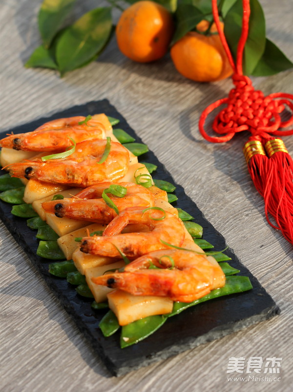 今天就介绍一款节日炒年糕的做法, 主要食材是鲜虾和年糕, 搭配上荷兰豆, 用煎过鲜虾的虾油炒年糕, 不仅让鲜味十足, 而且颜色也变成了金红色, 金色的年糕如同金砖,寓意 “财运滚滚、鸿运当头”; 摆盘和往常的做法不一样, 一层层食材的码好叠高,图个“节节升、年年高”的好彩头。