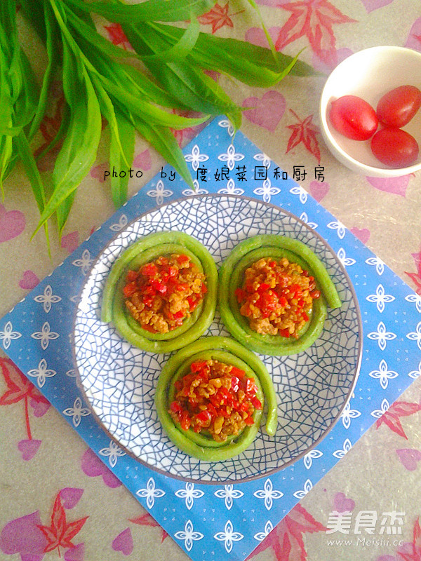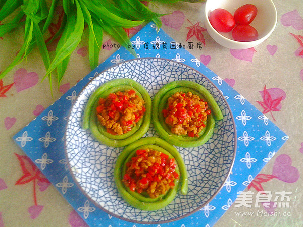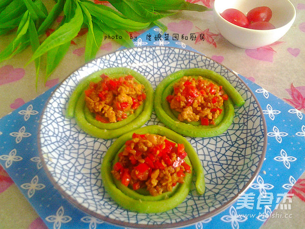 12.将过油瘦肉红椒末,用勺子放到豆角圆圈的中间位置,放蒸锅中隔水烧开再蒸5分钟即可。