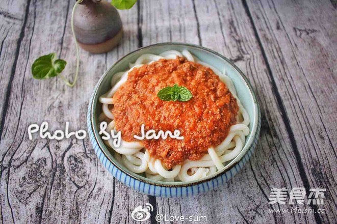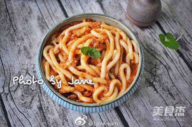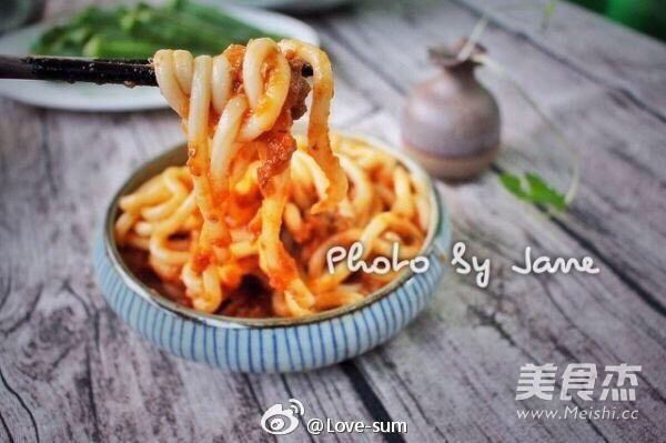 7.牛肉加水拌匀搅散,蕃茄酱回锅煮,将牛肉末倒入,边倒边搅散成碎末。如果有些结成大块,可用料理机稍稍打烂。试味直至自己喜欢的酸甜味,因为乌冬无味,肉酱可稍重味些。如果水份多,就再边搅拌边煮,煮至稠肉酱即可。乌冬开水煮熟后,捞起冲冷水,冲至冷却,再用饮用水过滤。然后就可以拌肉酱吃了