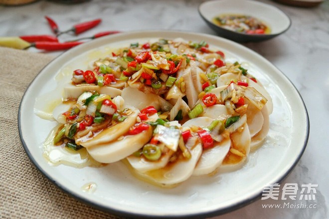 这道菜属于酱拌菜,比较开胃,葱油拌酱用油激香是关键,适合拌一些自身味道清淡却风味独特饿食材,比如油鸡,千张,杏鲍菇等