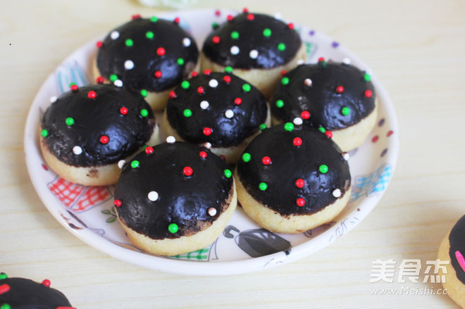 10.取一粒饼干将饼干的半边浸入融化的巧克力上,完成后表面稍微洒些装饰糖装饰即可。小胖直接用装饰糖装饰,这里还可以用各种果干、开心果、核桃仁等装饰,亲们自己选择噢!