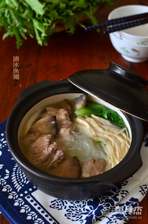 4.将砂锅中加入骨汤,开锅后将排骨及以上粉丝及蘑菇青菜放入,锅开后稍煮片刻,尝尝咸淡,加适量盐调味,就可以关火了。