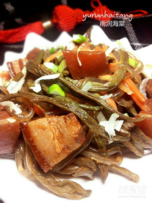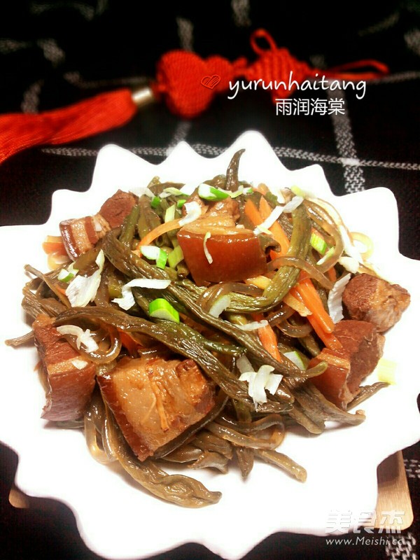 红烧肉是老少皆宜的一道家常菜,烧制出来的美味受到人们的喜爱,干豆角虽然没有新鲜豆角口感鲜嫩,但嚼起来更加劲道,因此吃起来感觉口感更加独特,和红烧肉放在一起炖味道真是好极了。 主料 干豆角50克 红烧肉100克 粉条(干)50克 辅料 胡萝卜20克 酱油10毫升 盐1克 葱3克 姜2克 蒜2克 红烧肉炖干豆角的做法 1.准备食材:红烧肉提前做好,干豆角泡发后用水焯一下,粉条用水泡软 2.锅中放入红烧肉 3.放入葱、姜、蒜末爆出香味 4.放入干豆角翻炒几下 5.放入粉条 6.放入酱油 7.放入适量水炖一会 8.汤汁收浓一些时加入胡萝卜丝 9.再加入少许盐即可 10.味道好极了 烹饪技巧 粉条加入的时间根据粉条是否劲道来决定,如果不耐煮就放晚点。