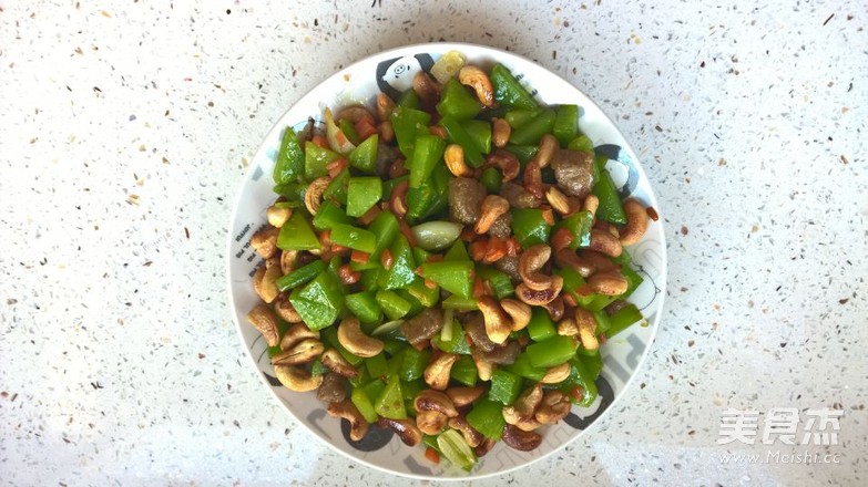 9.在盘中撒入炒好的腰果就OK啦(腰果还是脆的,如果倒入锅中翻炒,就会变软)。