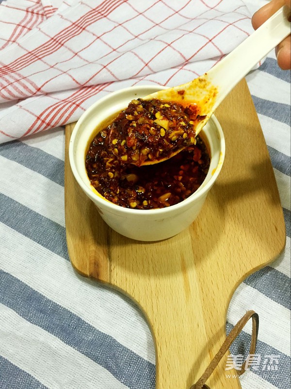 自家最普通的辣椒油,因为自己喜欢蒜香,加了好多蒜,榨出来的辣椒油真的很香哦. 主料 辣椒粉1大碗 蒜1头 芝麻1小把 辅料 植物油适量 蒜味辣椒油的做法 1.首先把蒜切末备用 2.接着把切好的蒜和辣椒粉放在一起就可以。 3.锅内放油,中火烧开,可以看见冒油烟的状态就可以了。然后晾到8成热,再浇入辣椒粉里。怎么为八成热,可以用一小块蒜放进油锅试一下,蒜能立刻浮起就可以了。 4.接着倒进辣椒粉里,要上下拌好,炸均匀。 5.炸好的辣椒油,红彤彤的,颜色很好 烹饪技巧 油一定要烧开,再晾到八成热,这样炸出的辣椒油才非常香。