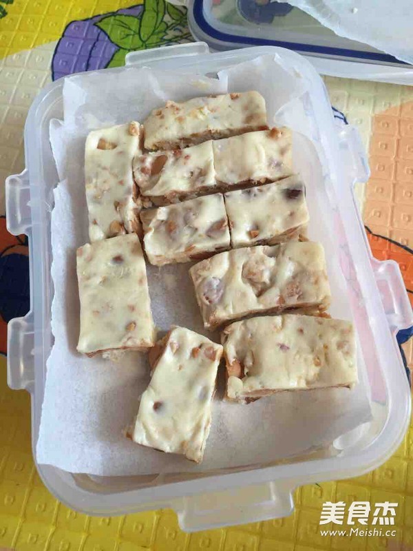 第一次尝试,效果还是不错的,这个主要是简单易上手 主料 棉花糖150克 花生(炒)150克 辅料 黄油30克 奶粉100克 棉花糖版牛轧糖的做法 1.家里放的生花生,在烤箱里150度烤5-10分钟,刚刚闻到香味就可以了,时间长容易糊。 2.电饭锅用保温键放入黄油,融化 3.放入棉花糖,均匀搅拌,至融化 4.加入奶粉,然后快速搅拌 5.加入适当碾碎的花生,搅拌均匀后乘出 6.按平,放凉即可 7.切块乘出 烹饪技巧 l棉花糖很甜,不用再放糖了。黄油不要太多,容易做出来的软。