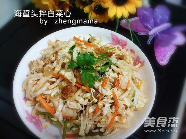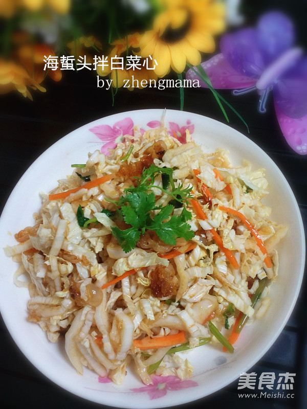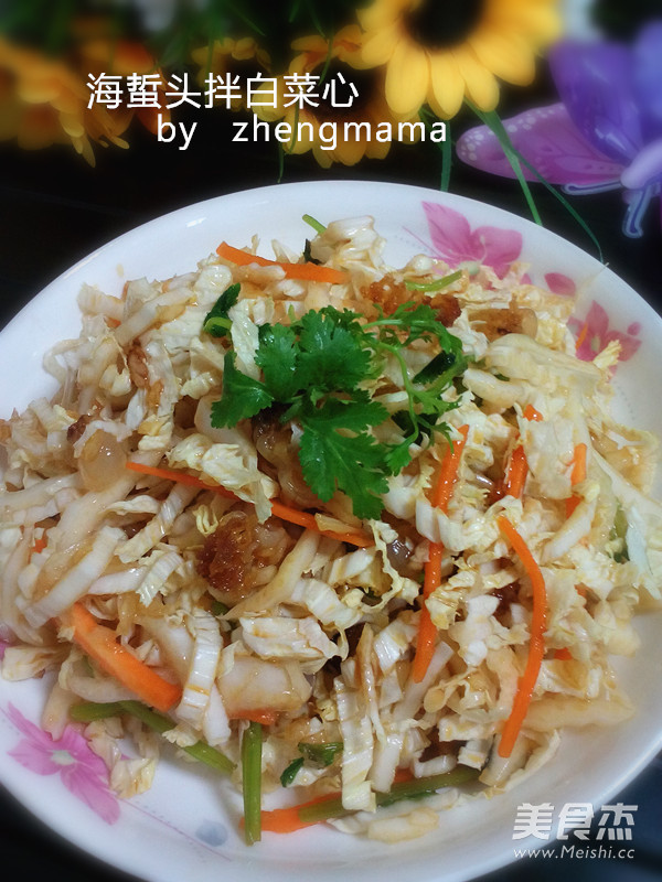 家常菜---海蜇头拌白菜心。这道菜是家里百吃不厌的一道小凉菜,不管是自己吃还是来客人都很不错,味道很清爽。 主料 白菜秧1个 海蜇头250克 香菜适量 胡萝卜1段 辅料 醋1勺 味极鲜酱油1勺 蚝油1勺 香油适量 海蜇头拌白菜心的做法 1.海蜇头用清水浸泡3小时。 2.洗净后挤干水分切成条。 3.入热水焯一下,不要用开水就烫没了。 4.取出沥水。 5.白菜心切成丝,香菜摘洗干净切段用热水烫一下,胡萝卜去皮洗净切成丝。 6.将白菜心,海蜇头放入干净盆中,加入胡萝卜丝,烫过的香菜段,加入味极鲜酱油。 7.加入蚝油,蒜泥。 8.加入醋。 9.加入香油拌匀即可。 烹饪技巧 海蜇头不要用开水烫,太烫的话海蜇头就收缩没了。