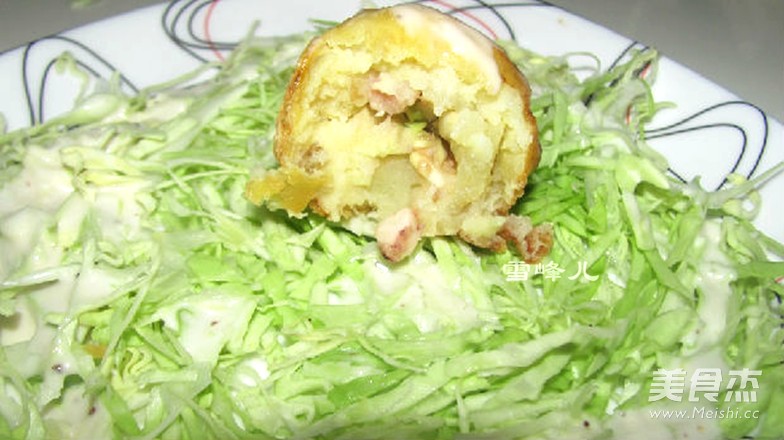 14.包菜切成细丝铺到盘中,放入章鱼小丸子,挤上沙拉汁