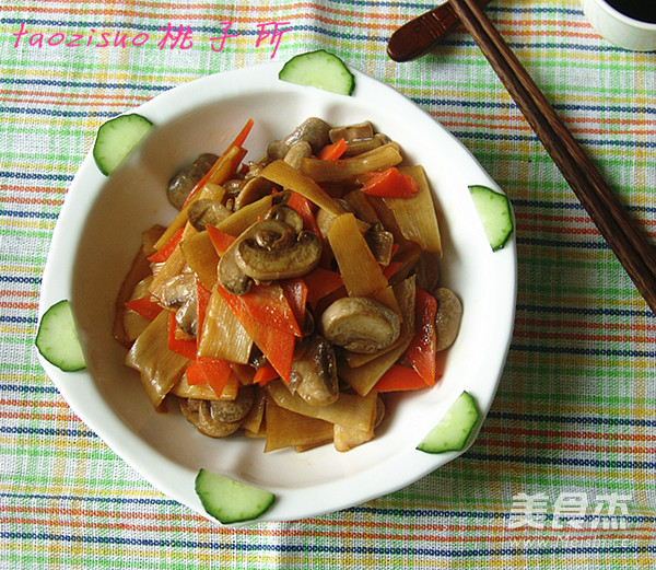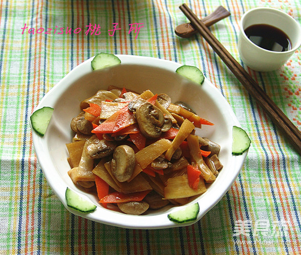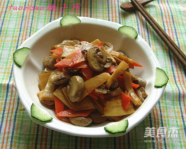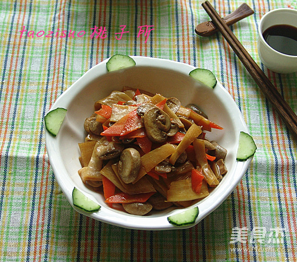 口蘑与笋片、胡萝卜片搭配,更增加了膳食纤维及维生素的含量。 这道菜咸鲜适口,也是下饭的一道好菜。