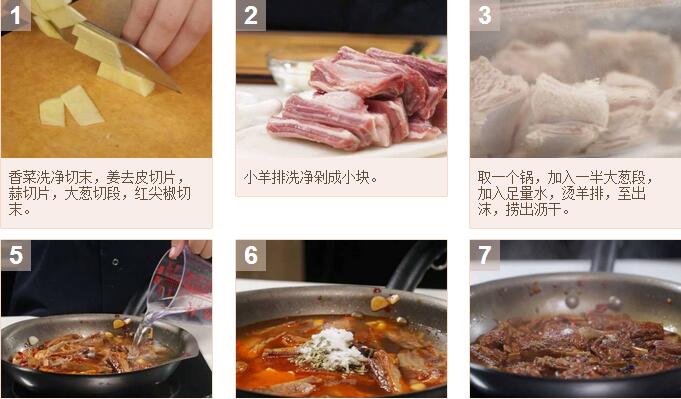 1.香菜洗净切末,姜去皮切片,蒜切片,大葱切段,红尖椒切末,小羊排洗净剁成小块。