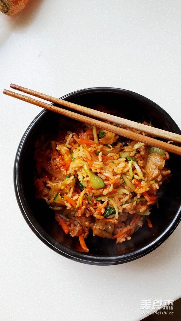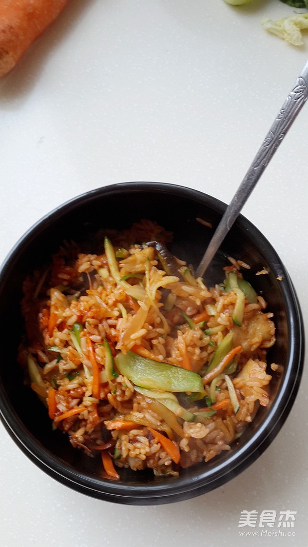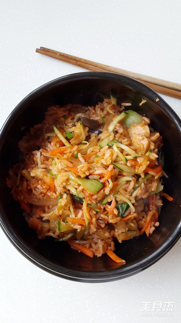 韩式辣酱炒饭 主料 米饭200克 茄子1/4个 鱼丸5个 油菜2颗 黄瓜10颗 胡萝卜1/4根 辅料 盐1茶匙 油20克 韩式辣椒酱1汤匙 韩式辣酱炒饭的做法 1.锅中烧热油加入茄子鱼丸等食材 2.加入胡萝卜,油菜等其它的食材 3.翻炒片刻,加入米饭继续翻炒 4.加入调味料翻炒禁运 5.出锅前加入黄瓜丝炒匀 6.最后盛出装盘即可 烹饪技巧 韩式辣酱炒饭