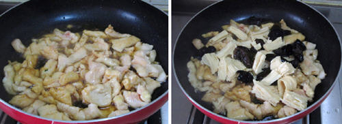 4、锅中注入油,烧热下入鸡肉片翻炒至变色。
