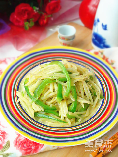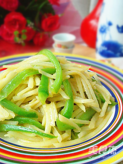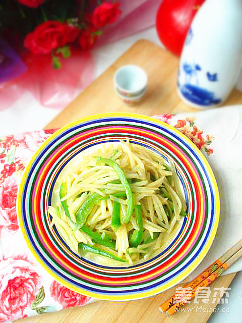 这道青椒土豆丝是我家餐桌出镜极高的一道菜,青椒口感脆爽,清香,搭配土豆丝的丝丝绵软,我觉得青椒和土豆是最搭的蔬菜了 主料 土豆200克 青椒1个 辅料 食用油2汤匙 盐3克 生抽1汤匙 葱1段 蒜3瓣 青椒土豆丝的做法 1.青椒切丝。 2.土豆礤丝,我刀工不好,切不出这么细的丝哈!土豆丝洗去表面淀粉,泡在水里备用,防止氧化变黑。 3.炒锅倒油,放入葱,蒜炒香。 4.放入土豆丝煸炒。 5.放入盐,生抽继续煸炒。 6.炒至土豆丝微微透明,放入青椒丝。 7.翻炒均匀,即可关火。 8.盛盘。 烹饪技巧 因为土豆丝很细,所以不要炒的时间太长。