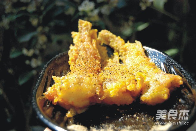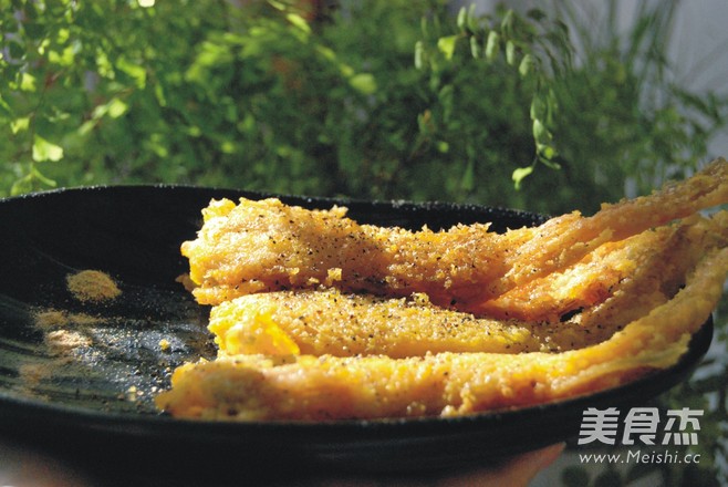4.油烧至七成热,下九肚鱼炸至两面外表皮呈金黄色