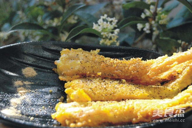 3.腌制后的九肚鱼滤去水,一切二蘸上生粉和吉士粉
