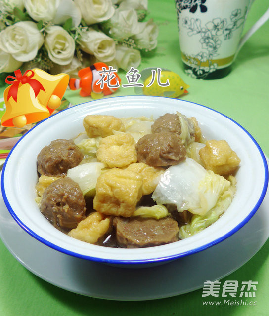 白菜是我们生活中最普通的一个做菜的原料。白菜古时又叫菘,有“菜中之王”的美名。白菜的营养价值很高。含有丰富的有蛋白质、脂肪、多种维生素和钙、磷等矿物质以及大量粗纤维,有清热除烦、解渴利尿、通利肠胃的功效。秋冬季节空气特别干燥,寒风对人的皮肤伤害极大。白菜中含有丰富的维生素C、维生素E,多吃白菜,可以起到很好的护肤和养颜效果。白菜、油豆腐和牛筋丸三种食材合为一体那么一煮味道不错,有营养。。。