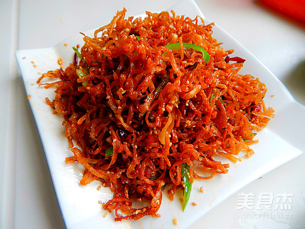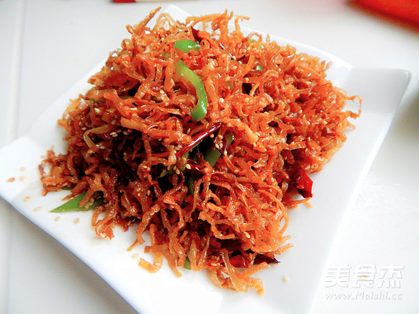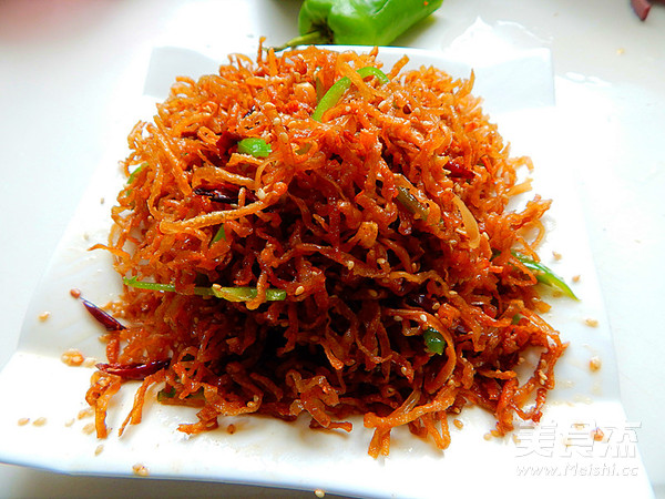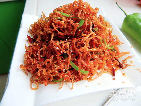 来一道非常香脆下饭的菜吧 主料 豆丝300克 干辣椒15克 芝麻10克 辅料 生抽4克 盐3克 干煸豆丝的做法 1.干豆丝提前泡发 2.干辣椒剪开 3.锅里倒入油烧开 4.加入豆丝炸 5.另起锅加油倒入剪碎的辣椒 6.然后把辣椒炒出红油 7.加入炸过的豆丝 8.炒匀后加入芝麻 9.加入青椒 10.不停的翻炒 11.然后加入生抽 12.大火翻炒,炒匀后加入盐 13.大火火翻炒均匀 14.炒好后装盘 15. 烹饪技巧 炸的过程中得注意看,高火快炸 炸至金黄即可