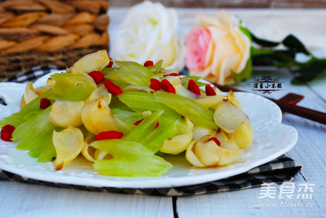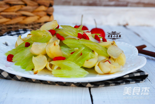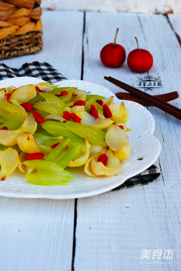 1.西芹削老皮,斜着切断;新鲜白合掰成片。