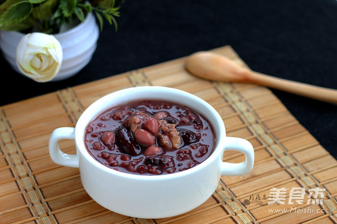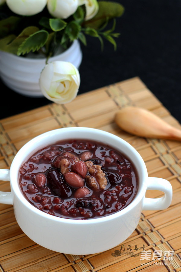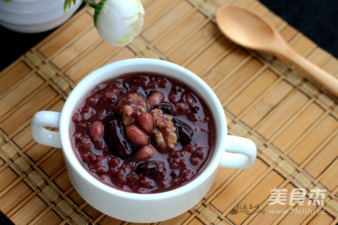大米1/8杯 小米1/8杯 黑米1/8杯 糯米1/8杯 红米1/8杯 核桃1小把 红豆1小把 黑豆1小把 红枣8颗 花生1小把