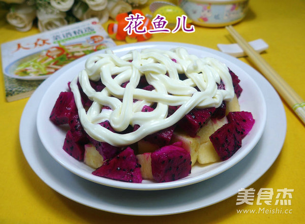 花鱼儿家的吃吃。。。 主料 苹果1只 火龙果半只 辅料 沙拉酱适量 沙拉双果的做法 1.食材:苹果、火龙果、沙拉酱 2.将苹果清洗清洗去皮,放在案板上切成小块,待用。 3.接着,将火龙果去皮,放在案板上切成小块。 4.然后,将切好的苹果和火龙果搁入盘子中。 5.最后,挤上沙拉酱,即成。