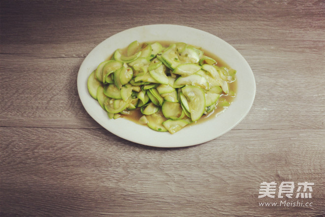 3.倒入西葫芦不停翻炒,等西葫芦塌架软后,放入蒸鱼豉油,盐和少许鸡精。